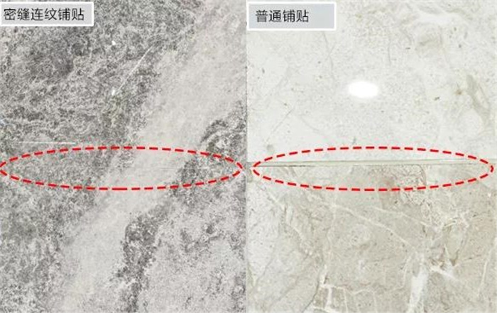 相比于普通铺贴工艺瓷砖1-1.5mm的留缝,使用“密缝连纹铺贴”大角鹿密缝连纹大理石瓷砖缝隙细达0.3mm,整体视觉自然更加美观精致,让人能轻易感受到细腻的瓷砖纹理效果。