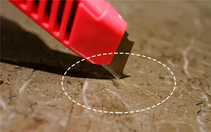 钢刷试验轻松通过,那么在接触面积更小,更锋利的刀锋试验下,瓷砖是否能够同样无伤通关呢?
