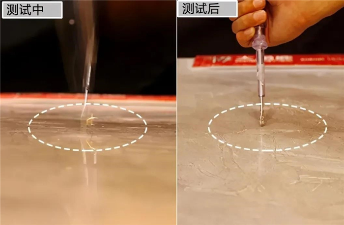 大角鹿超耐磨大理石瓷砖独创“超耐磨钻石釉”国家专利技术,超耐磨钻石釉釆用全球第一的釉料公司,意大利卡罗比亚釉料,耐磨度达4级以上,比普通瓷砖耐磨度高出3倍。我们现场使用莫氏硬度笔进行检测,分别使用1-5级硬度笔逐步升级进行测试。