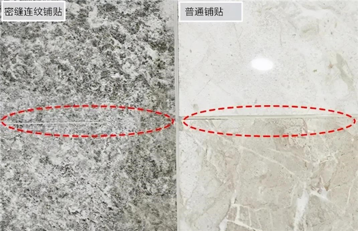 相比于普通铺贴工艺瓷砖1-1.5mm的留缝,大角鹿密缝连纹大理石瓷砖缝隙细达0.3mm,整体视觉自然更加美观精致,让人能轻易感受到细腻的瓷砖纹理效果。