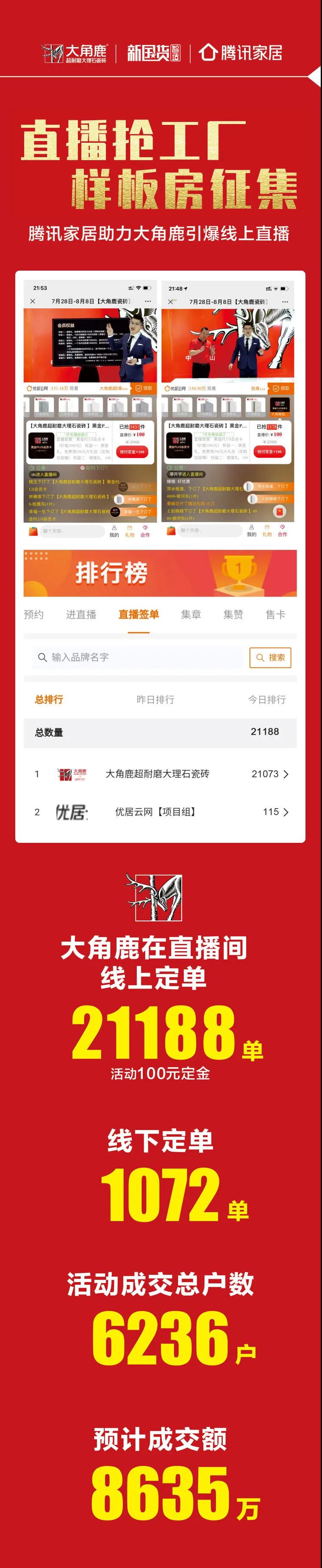 8月8日,在“直播抢工厂 样板房征集”活动中,腾讯家居助力大角鹿引爆线上直播,大角鹿超耐磨成功吸引了151.18万业主在线观看,通过直播间下定21188单,成交客户6236户,预计成交额8635万。