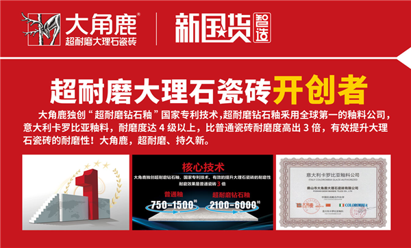 大角鹿,独创“超耐磨钻石釉”国家专利技术,超耐磨钻石釉采用全球第一的釉料公司,意大利卡罗比亚釉料,耐磨度达4级以上,比普通瓷砖耐磨度高出3倍。截止11月6日,2020年大角鹿超耐磨大理石瓷砖已成功新开拓373家专卖店,全国1057家专卖店