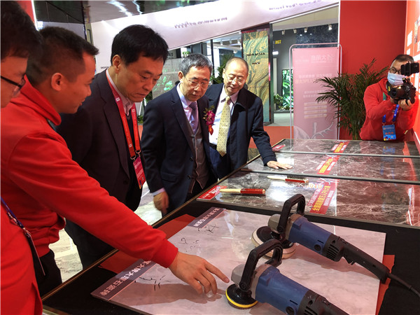 中国轻工业联合会副会长兼秘书长、中国陶瓷工业协会理事长杜同和(中间)等领导参观大角鹿展位。