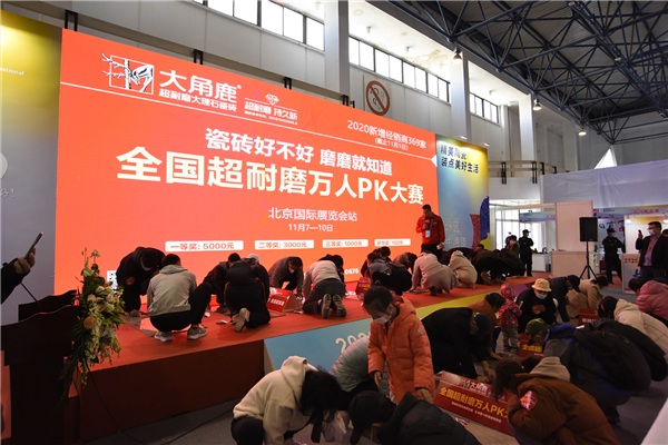 腾讯家居、新浪家居、天猫、抖音、百度、陶卫网六大平台同步直播大角鹿全国超耐磨万人PK大赛·北京国际陶瓷展站。
