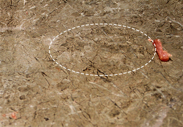 之后观察测试区的磨损情况,没有刀痕留下,猪肉的油污经简单擦拭后也完全消失,砖面光洁如初,耐磨又抗污,大角鹿瓷砖真不错。