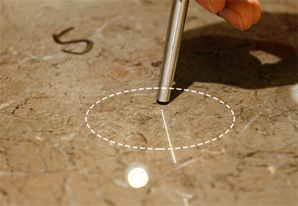 大角鹿超耐磨大理石瓷砖独创“超耐磨钻石釉”国家专利技术,超耐磨钻石釉釆用全球第一的釉料公司,意大利卡罗比亚釉料,耐磨度达4级以上,比普通瓷砖耐磨度高出3倍。我们现场使用莫氏硬度笔进行检测,分别使用1-5级硬度笔逐步升级进行测试。