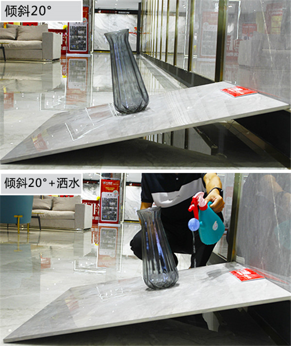 在防滑测试中,评测人员将瓷砖的砖面倾斜度调整至20°左右,在上面放上花瓶。在光洁的瓷砖上,花瓶并无滑落迹象;接着,现场测评人员,在瓷砖的表面洒上水,模仿家里地面有水的情况出现,但瓷砖表面的花瓶始终不动。