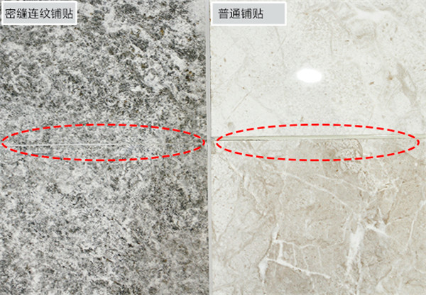相比于普通铺贴工艺瓷砖1-1.5mm的留缝,大角鹿密缝连纹大理石瓷砖缝隙细达0.3mm,整体视觉自然更加美观精致,让人能轻易感受到细腻的瓷砖纹理效果。