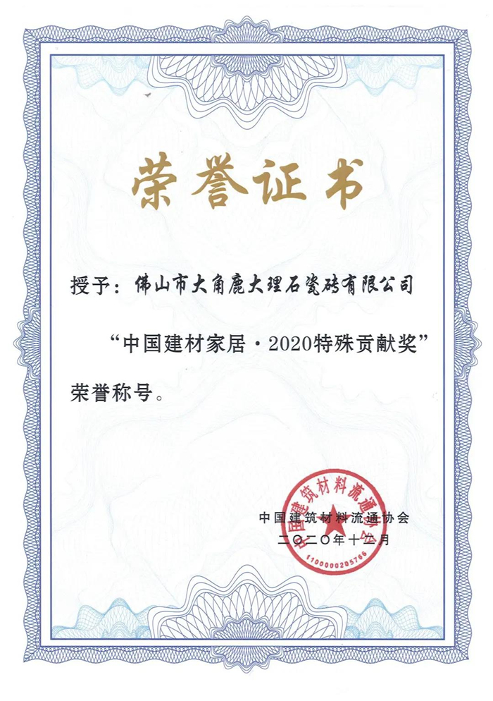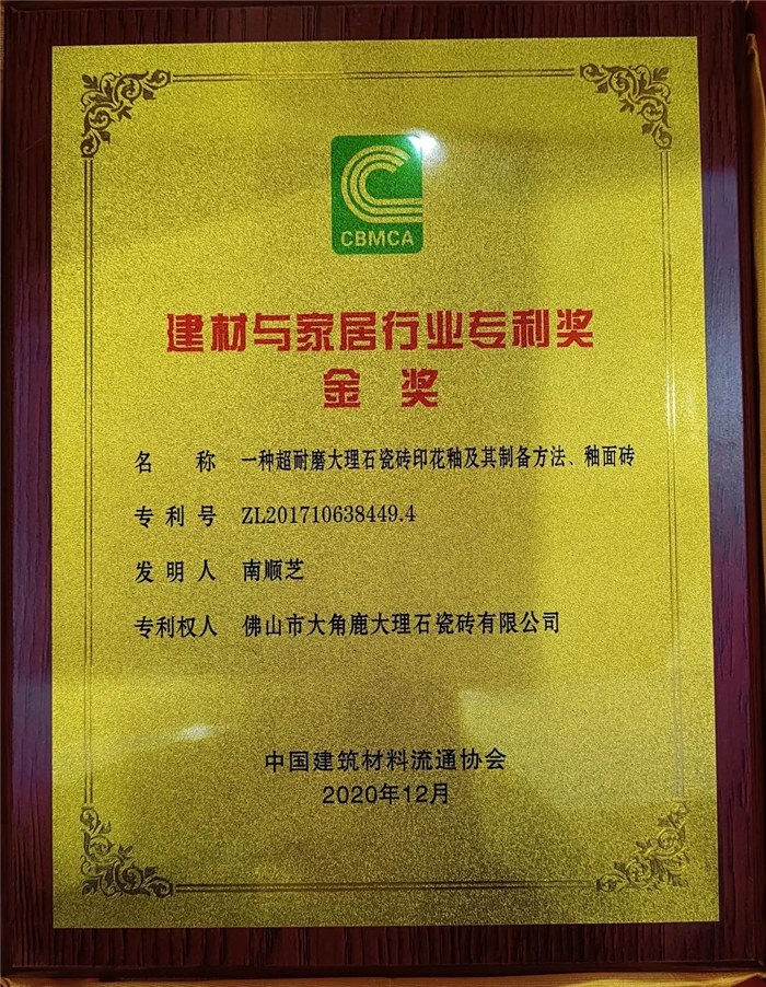 凭借引领全球的超耐磨技术,大角鹿在经过初评后于10月23—24日在北京中国建筑文化中心再次通过了专家终审,荣获2020年中国建材与家居行业专利奖•金奖和中国建材家居•2020特殊贡献奖两大奖项,并于12月13日在中国科技会堂荣耀加冕。国家科技部、工信部、商务部、全国总工会等相关领导现场为获奖单位颁奖。