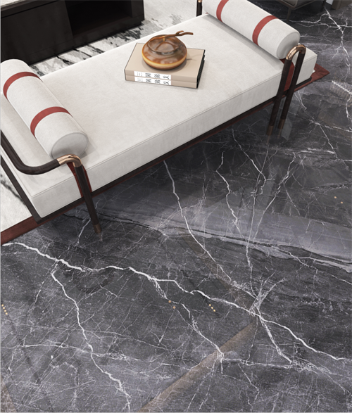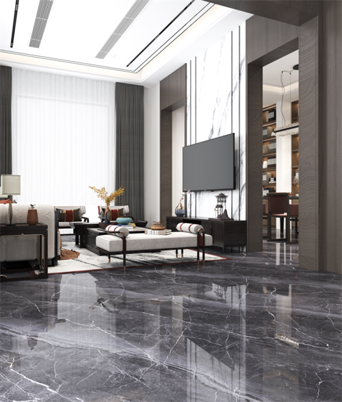 伊朗灰,纹理自然丰富,把高级灰发挥得淋漓尽致。在现代新中式布艺沙发和中国经典书籍的映衬下,传统和现代的雅致韵味扑面而来。