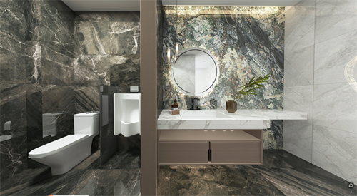 公共卫生间做了干、湿区域设计,沐浴和洗漱互不影响。大理石元素,几分浓墨重彩,凸显时尚典雅的气质。