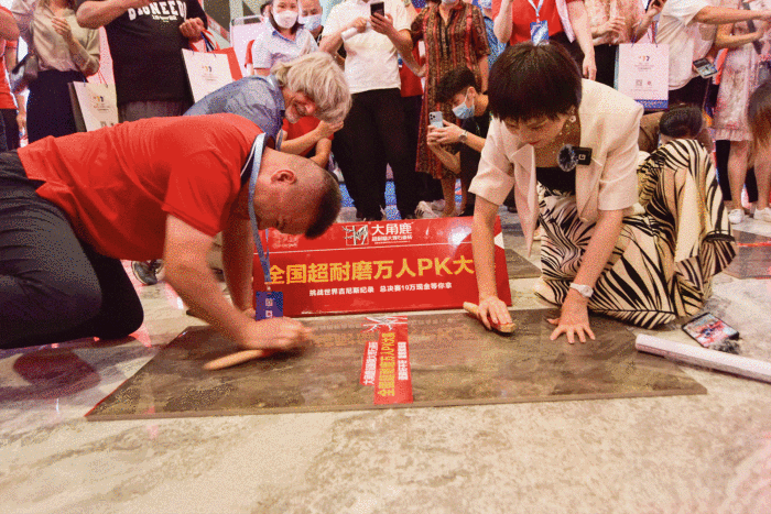 大角鹿超耐磨万人PK大赛虽然在全国238个城市举办了1800多场,但是大角鹿全国超耐磨万人pk大赛·佛山陶博会站人气依然非常火爆,每场活动都是被“人海”包场,现场观众拿起钢刷用力摩擦大角鹿瓷砖,体验大角鹿超耐磨品质,吸引无数观展商驻足观看。