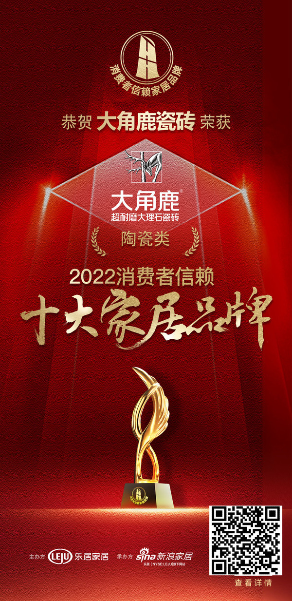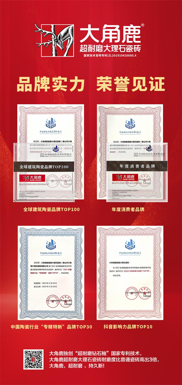 在2022全球陶瓷新生态年终盘点活动现场,大角鹿荣获“2022全球建筑陶瓷品牌TOP100”、“2022中国陶瓷行业专精特新品牌TOP30”、“2022抖音影响力品牌TOP10”、“年度消费者品牌”等奖项,成为“大满贯”品牌!
