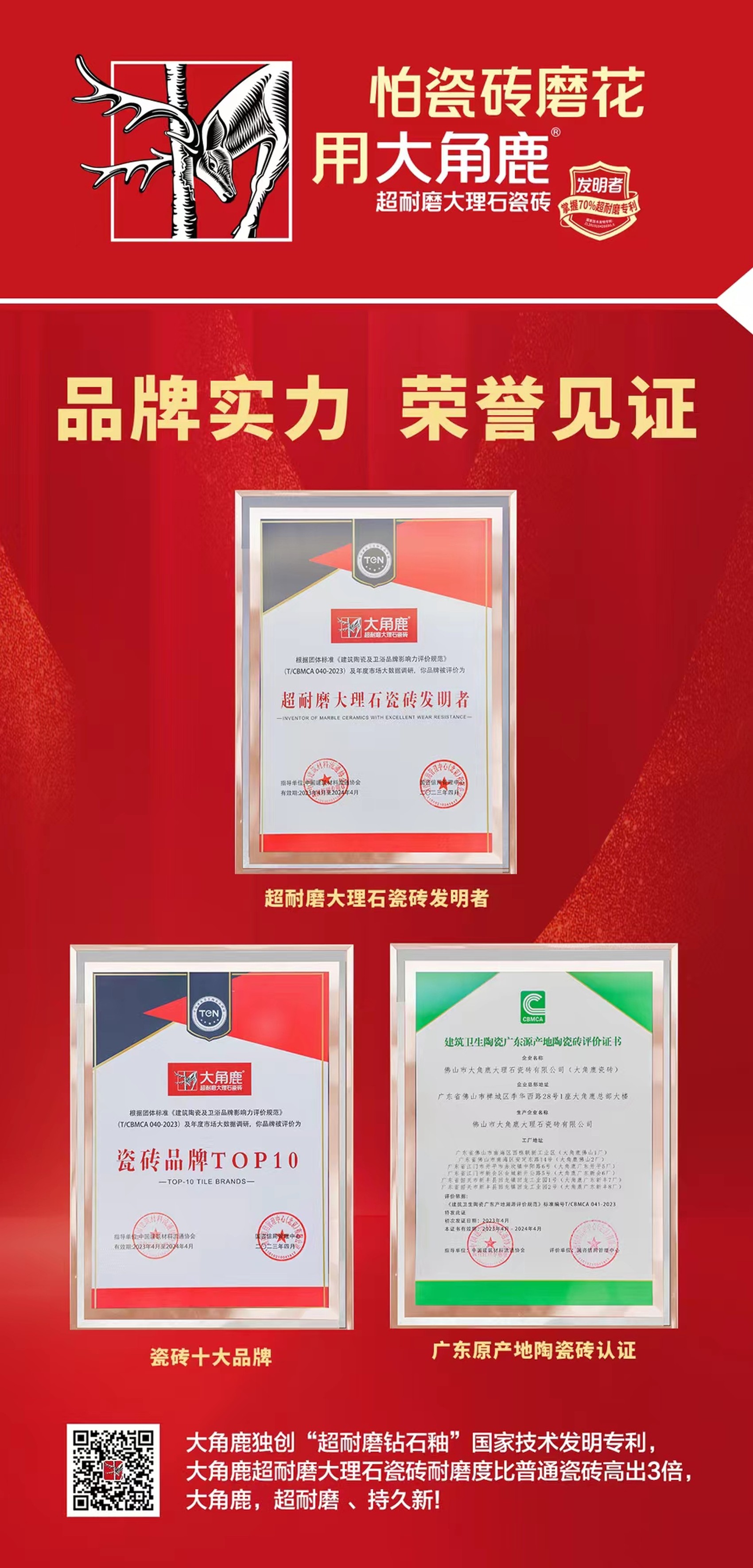 作为超耐磨大理石瓷砖发明者,大角鹿掌握了超耐磨瓷砖核心技术,拥有超70%的超耐磨发明专利。未来,大角鹿将继续坚持技术创新,致力于超耐磨陶瓷新材料的研发与生产,让亿万家庭使用上高品质的超耐磨瓷砖,代表中国瓷砖品牌走向全球。