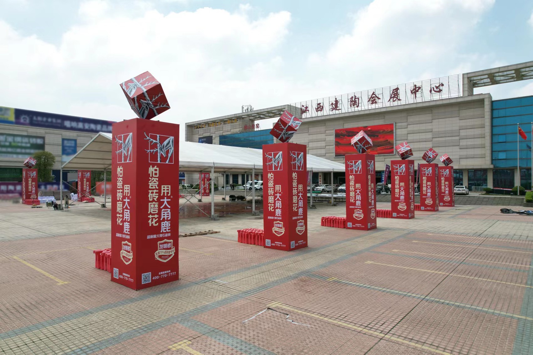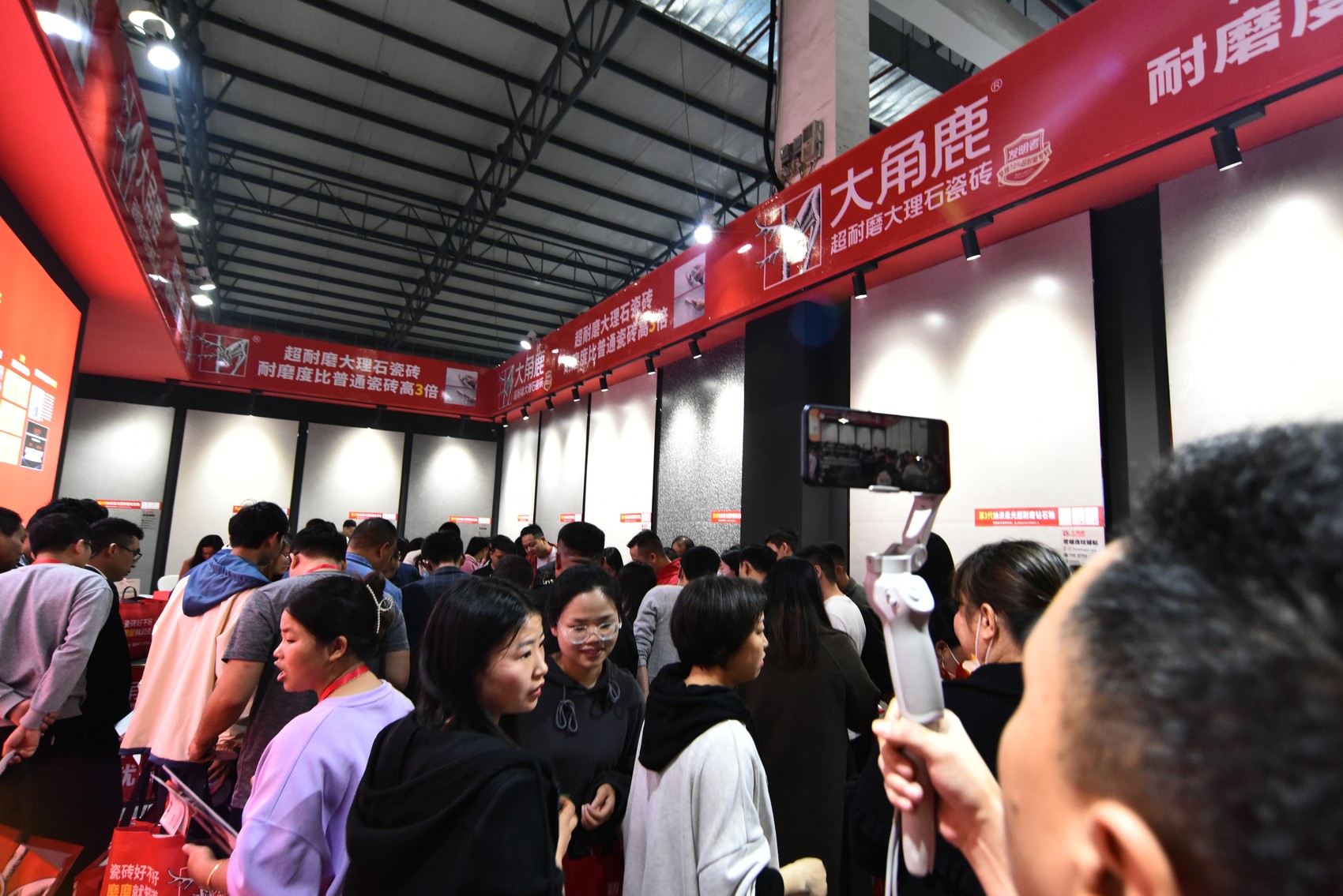 从江西建陶会展中心周边步入,沿途随处可见大角鹿,一路引向展馆,令每位前来观展的观众深刻感受到大角鹿的红火。进入会馆,由“大角鹿红”构建而起的大面积展位非常引人注目,展厅内部观展人潮络绎不绝。