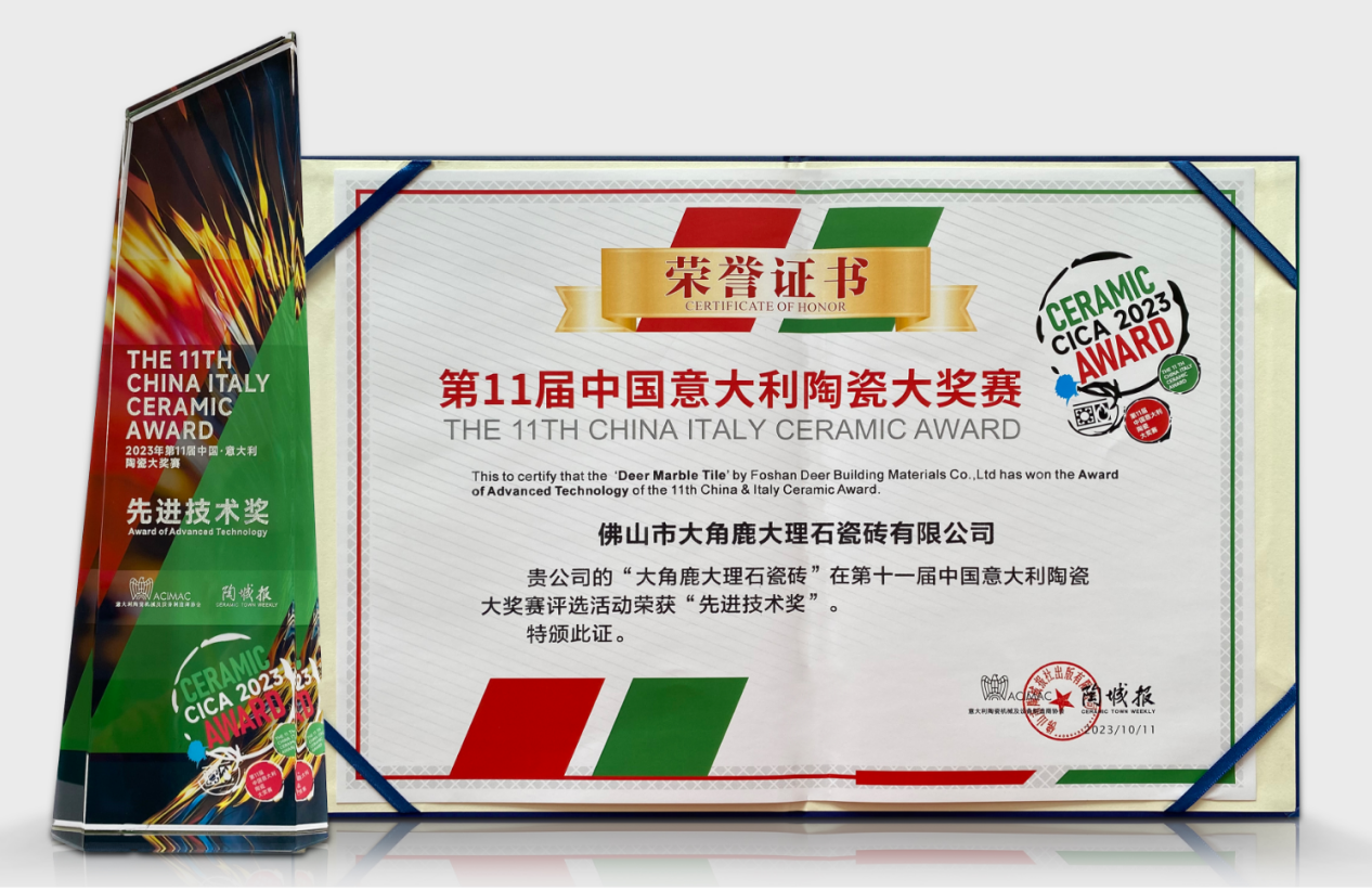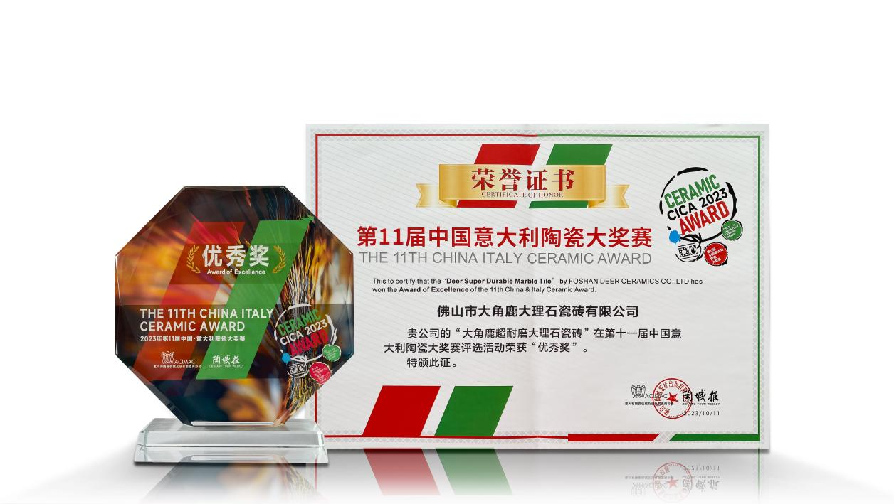 当天同时也是第11届中国意大利陶瓷大奖赛的颁奖盛典,中国瓷砖增长王大角鹿凭借引领全球的超耐磨技术与卓越的产品品质,在全球瓷砖品牌中脱颖而出,成功斩获“先进技术奖”“大赛优秀奖”两大奖项。