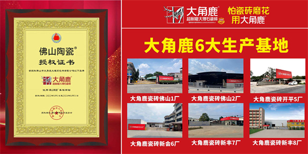 大角鹿作为“超耐磨大理石瓷砖发明者”,拥有超七成超耐磨国家发明专利技术,是耐磨度全球第一和超耐磨发明专利数量第一的瓷砖品牌。同时,大角鹿也是首批上榜“佛山陶瓷”商标授权品牌,凭借其六大生产基地卓越的制造实力,向广大消费者展现了正宗广东砖的高标准水平。
