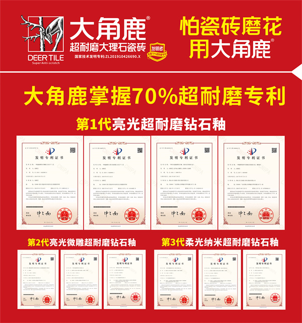 大角鹿作为“超耐磨大理石瓷砖发明者”,拥有超七成超耐磨国家发明专利技术,耐磨度达4级以上,耐磨度比普通瓷砖高出3倍。大角鹿是耐磨度全球第一和超耐磨发明专利数量第一的瓷砖品牌。