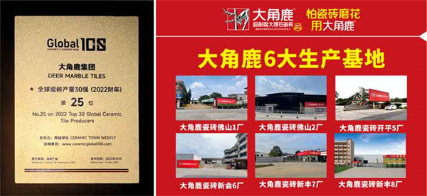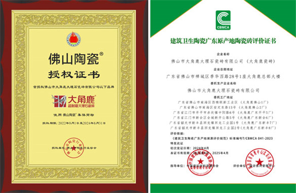 “世界陶瓷看中国,中国陶瓷看佛山,佛山陶瓷闻名全球。”大角鹿上榜首批“佛山陶瓷”商标授权品牌,获“广东原产地陶瓷砖认证”,并凭借其六大生产基地卓越的制造实力,向广大消费者展现了正宗广东砖的高标准水平。