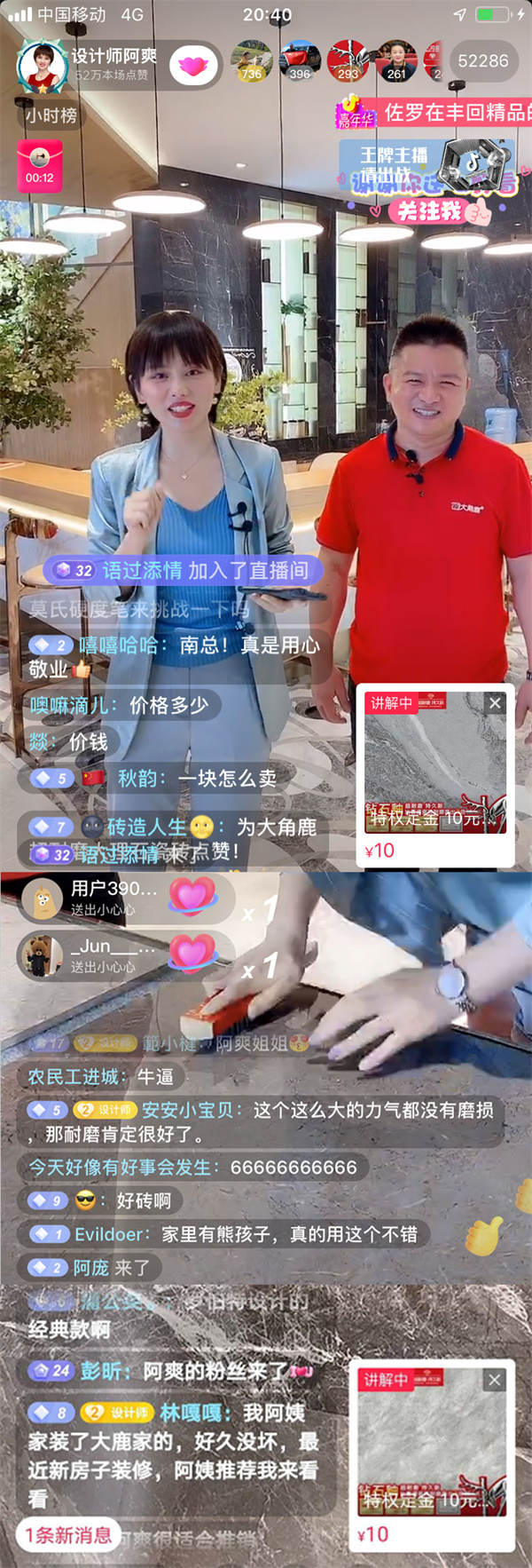 大角鹿到底有多耐磨?超耐磨又是怎样炼成的?爱设计超过爱男人的设计师阿爽来大角鹿总部直播挑战全球超耐磨瓷砖之王。通过钢刷、打磨机、倒立推倒、冰刀鞋等破坏性很强的震撼对比测试,设计师阿爽直言大角鹿真的是超耐磨,2000多万粉丝隔着屏幕感受到大角鹿超耐磨,在直播间留言尖叫太牛了!