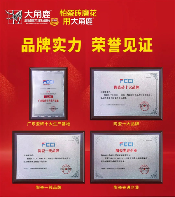 品牌荣誉,实力见证。此次荣获“广东瓷砖十大生产基地”、“陶瓷十大品牌”、“陶瓷一线品牌”、“陶瓷先进企业”等重量级奖项,是行业对大角鹿品牌实力和影响力的高度肯定和赞许!