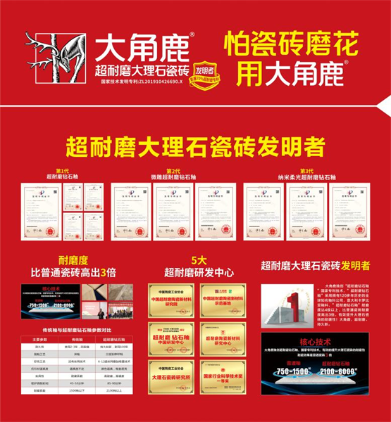 大角鹿作为“超耐磨大理石瓷砖发明者”,拥有超七成超耐磨国家发明专利技术,荣获美国超耐磨发明专利和欧盟超耐磨发明专利,是首个通过德国莱茵超耐磨认证的中国瓷砖品牌,耐磨度达4级以上,耐磨度比普通瓷砖高出3倍。大角鹿是耐磨度全球第一和超耐磨发明专利数量第一的瓷砖品牌。