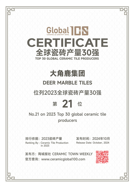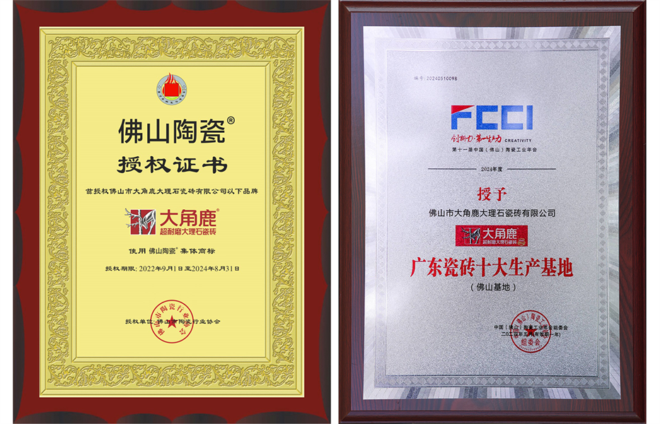 “世界陶瓷看中国,中国陶瓷看佛山,佛山陶瓷闻名全球。”大角鹿上榜首批“佛山陶瓷”商标授权品牌,荣获“广东瓷砖十大生产基地”、“全球陶瓷产量30强(第21位))”,并凭借其全球六大生产基地卓越的制造实力,向全球消费者展示了广东砖的高标准水平。