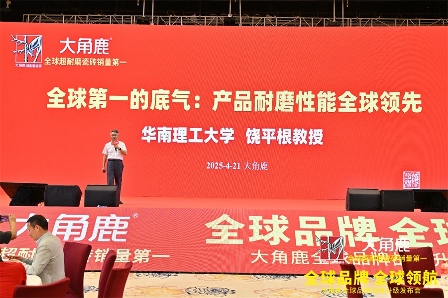 华南理工大学饶平根教授详细解析了大角鹿超耐磨瓷砖技术优势,并介绍了品牌最新研发的“耐磨王”瓷砖。这款挑战全球最高标准的6000转极限耐磨瓷砖,耐磨性能远超行业标准,堪称全球耐磨瓷砖的“王者”。这款新产品由大角鹿联合华南理工大学材料学院历经2年共同研发,独创第四代蓝宝石晶体超耐磨钻石釉工艺技术,该技术已获国家发明专利,在陶瓷材料科学领域断层领先,使瓷砖耐磨性能至少领先同行3-5年。