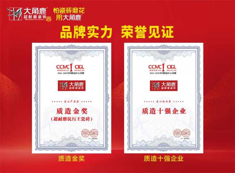 凭借引领全球的超耐磨技术和强大的品牌实力,大角鹿瓷砖在2025中国陶瓷质造大会暨匠心荣耀榜颁奖盛典上荣获“质造十强企业”和“质造金奖”两项大奖。