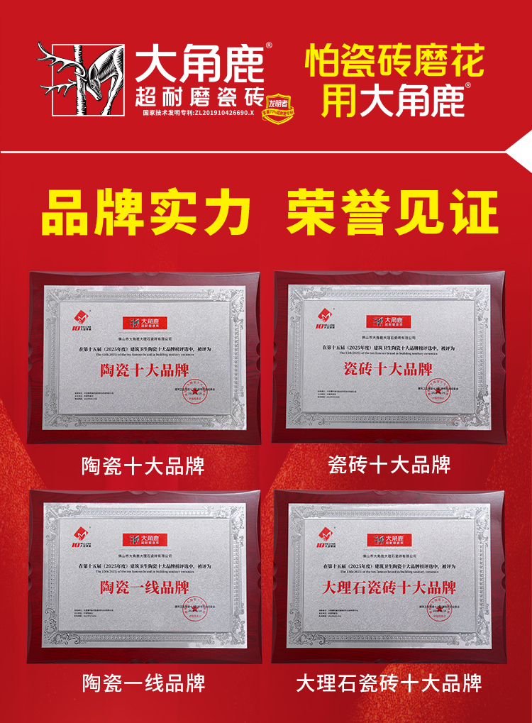 此次斩获“陶瓷十大品牌”“瓷砖十大品牌”“陶瓷一线品牌”“大理石瓷砖十大品牌”等多项大奖,是对大角鹿十余年专注技术创新、坚守品牌价值的高度认可。未来,大角鹿将继续深耕超耐磨、超抗污技术赛道,强化智能制造体系,拓展全球市场布局,以技术定义价值,以品牌赢得市场,为世界讲好中国瓷砖的品牌故事,为品牌强国注入创新动能,在全球建陶版图上写下属于中国瓷砖的技术与品牌荣光。