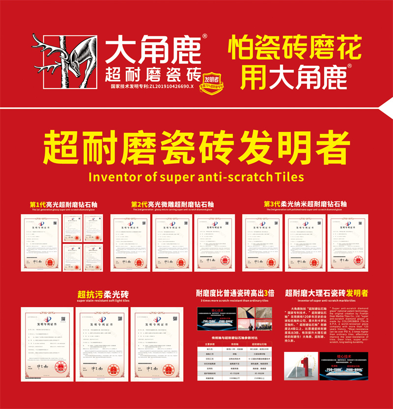 大角鹿拥有超七成超耐磨国家发明专利技术,荣获美国和欧盟超耐磨发明专利,是首个通过德国莱茵超耐磨认证的中国瓷砖品牌,其产品耐磨度达4级以上,耐磨度比普通瓷砖高出3倍。大角鹿瓷砖被广泛应用于新西兰希尔顿酒店、吉隆坡万豪酒店、科隆坡香格里拉酒店、日本DANS LE COEUR酒店、马来西亚喜来登酒店、宝马中国总部等高档装修项目。