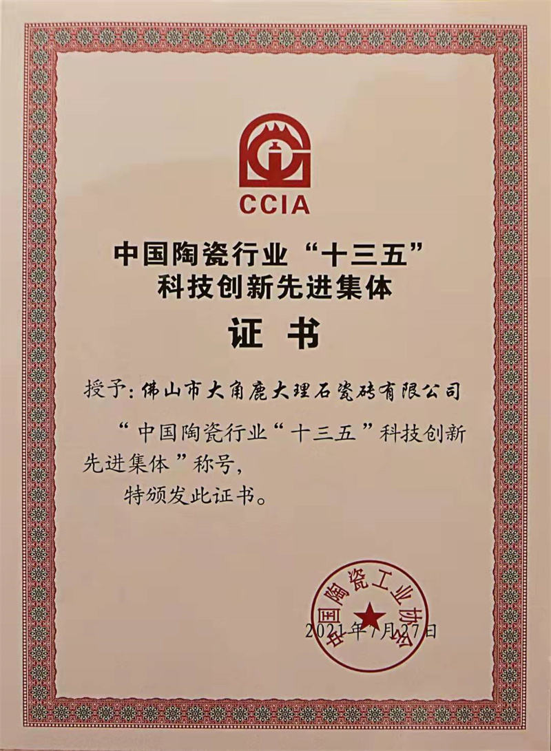 - 2021年7月27日,中国陶瓷业协会授予大角鹿中国陶瓷行业“十三五”科技创新先进集体。