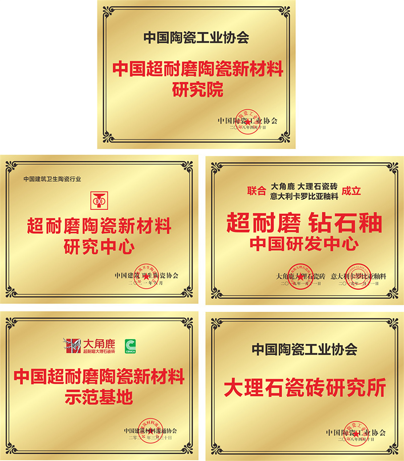 - 中国陶瓷工业协会授予大角鹿“中国超耐磨陶瓷新材料研究院”