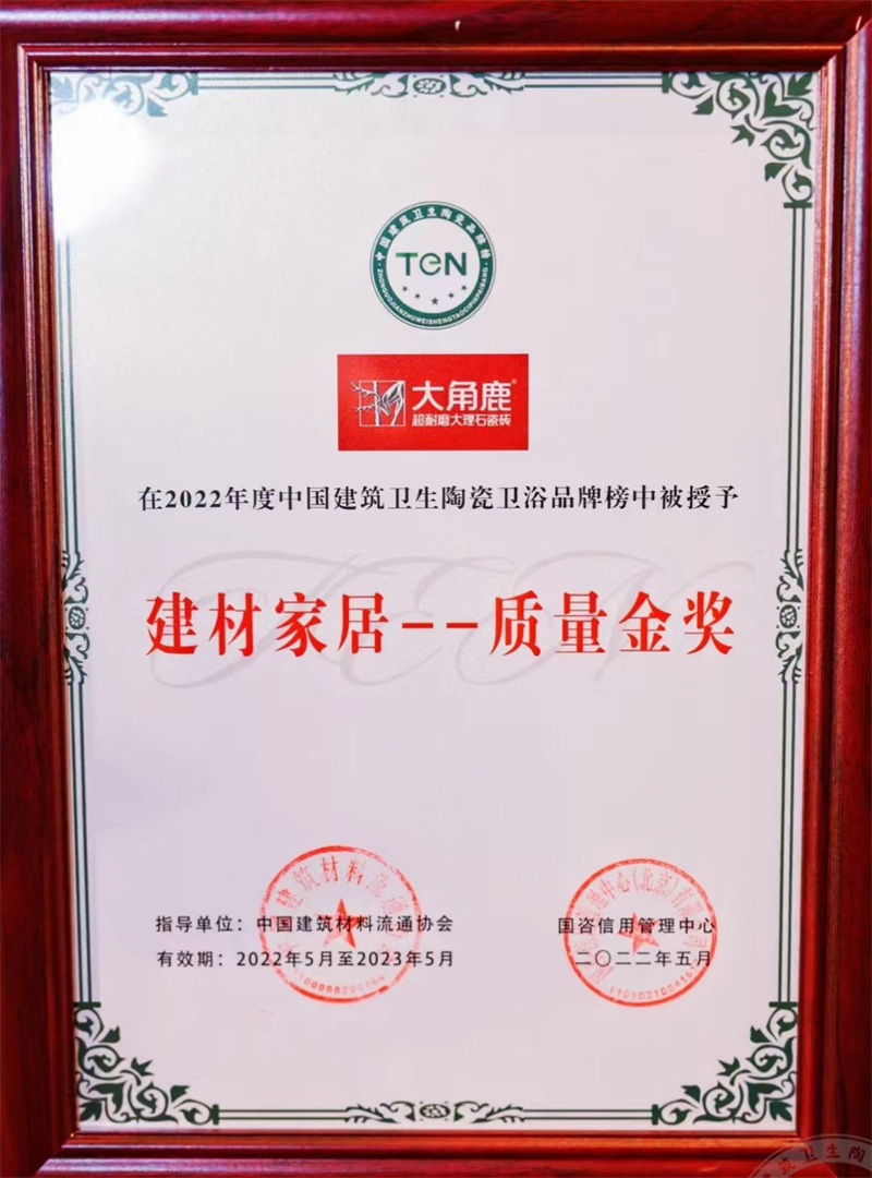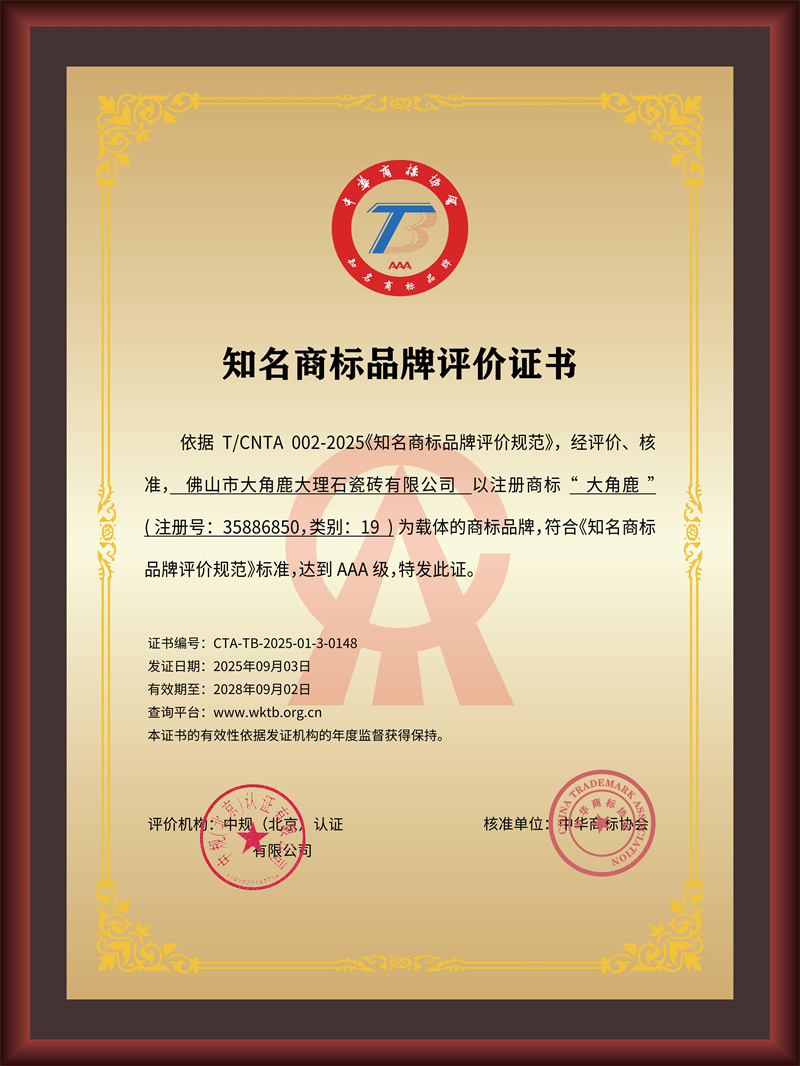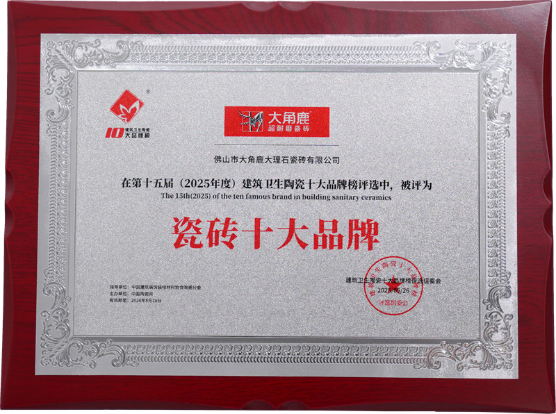 世界陶瓷看中国,中国陶瓷看佛山。凭借引领全球的超耐磨技术和品牌实力,大角鹿荣获国家行业科学技术奖一等奖、中国意大利陶瓷设计大奖赛金奖、陶瓷十大品牌、瓷砖十大品牌、AAA(国家级)知名商标品牌等各大权威奖项,并成功上榜首批“佛山陶瓷”集体商标授权品牌。