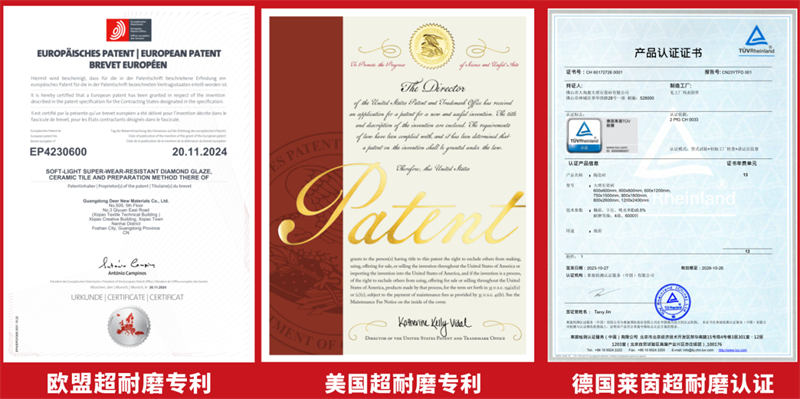 目前,大角鹿掌握中国超过70%的超耐磨发明专利,并获得美国、欧盟超耐磨发明专利,成为耐磨度全球第一、超耐磨发明专利数量第一的瓷砖品牌。
