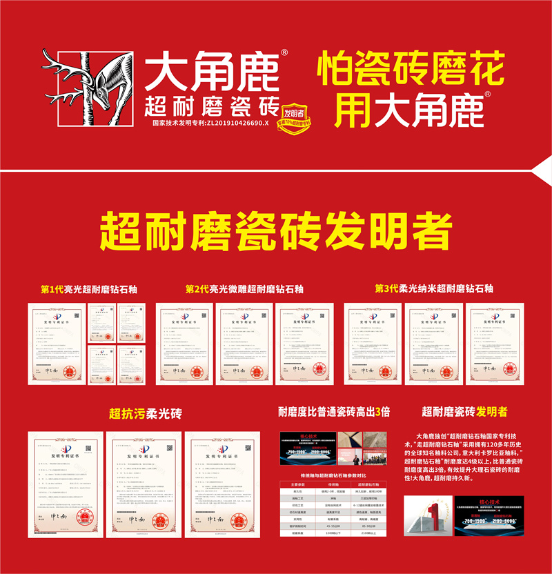大角鹿深耕超耐磨新材料领域,掌握行业超七成的超耐磨国家发明专利,主导建立全球首个“超耐磨陶瓷新材料研究中心”,并深度参与制定多项行业及国家标准,获得了美国、欧盟超耐磨发明专利及德国莱茵TÜV超耐磨认证,成为耐磨度全球第一和超耐磨发明专利数量第一的瓷砖品牌,构建起坚实的全球技术壁垒,为佛山陶瓷在国际舞台上树立了技术标杆。