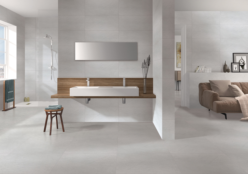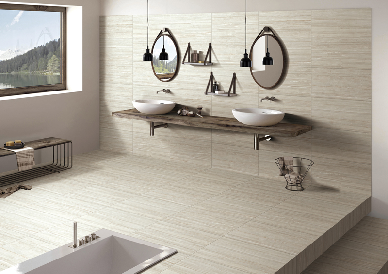 普通的大理石瓷砖虽然可以在瓷砖表面形成媲美天然大理石的纹理,但是一旦遇到开槽、倒角等深加工,纯色坯体就会暴露,因此在空间应用方面受到了限制。通体的概念起源于抛光砖,而应用到大理石瓷砖上是这两年的事情。主要采用了在坯料中混入有色粉料的方式,通过布料机的精准布料以达到与釉面纹理色彩相呼应的效果,在观感上营造出表里如一的效果。