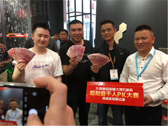大角鹿超耐磨千人PK大赛吸引了近千人参加,10万多人通过新浪、腾讯等直播观看了震撼的超耐磨PK大赛,共同见证每一片大角鹿超耐磨大理石瓷砖耐磨度是普通瓷砖的3倍,大角鹿,超耐磨!