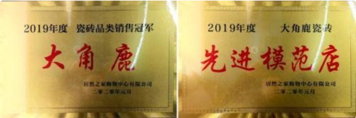 作为中国高端建材市场风向标的居然之家,同样传来了大角鹿的喜讯。凭借超高品质和出色的销售成绩,大角鹿摘得“瓷砖品类销量冠军”桂冠,荣获居然之家“瓷砖品类王”和“卖场先进模范店”称号。